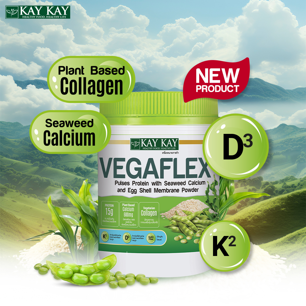 Kay Kay Vegaflex ‘เคย์ เคย์ เวก้าเฟล็กซ์’ เป็นมากกว่าโปรตีนจากพืช เพราะประกอบด้วยแคลเซียม 100 มิลลิกรัมต่อหนึ่งหน่วยบริโภค เสริมประสิทธิภาพในการเสริมสร้างความแข็งแรงให้กับกระดูกและข้อด้วยคอลลาเจน และมีวิตามิน D3 ช่วยร่างกายในการดูดซึมแคลเซียม รวมถึงวิตามิน K2 ช่วยคงสภาพของกระดูก ลดภาวะการเสื่อมของกระดูก ไม่มีส่วนผสมถั่วเหลือง, ไม่มีกลูเตน, ไม่ผสมนมวัว ผู้ที่รับประทานมังสวิรัติสามารถรับประทานได้