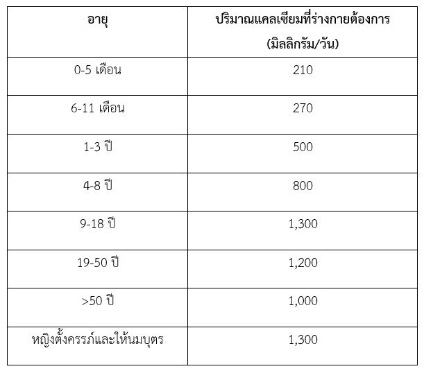 เพราะแคลเซียม เป็นแร่ธาตุสำคัญของกระบวนการทำงานของร่างกาย ทั้งเป็นส่วนประกอบของกระดูกและฟัน และช่วยให้การทำงานของส่วนต่างๆ ของร่างกายมีประสิทธิภาพ แคลเซียมจึงเป็นแร่ธาตุที่ควรได้รับในปริมาณที่เหมาะสมกับช่วงอายุ โดยตามหลักโภชนาการระบุดังนี้