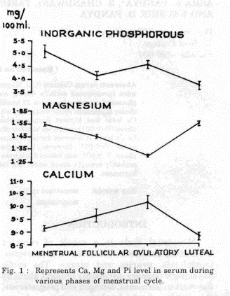 จากงานวิจัยในอาสาสมัครนักศึกษาแพทย์ที่มีสุขภาพดี 25 คน เพื่อศึกษาระดับแร่ธาตุสำคัญในเลือดในช่วงมีประจำเดือน ประกอบด้วย แคลเซียม (Ca) แมกนีเซียม (Mg) และฟอสฟอรัสอนินทรีย์ (Pi) ตามลำดับในระหว่างรอบประจำเดือน